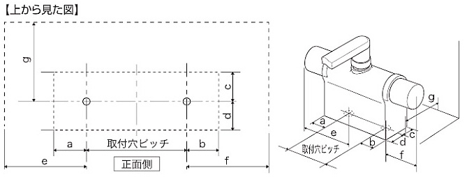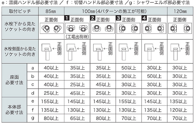 ![]() 【取付穴の条件】 取付穴径25±2/取付穴ピッチ85mm,100mm,120mmである事を確認してください。 【座面必要寸法】 取付カウンターに、下表の取付面が確保出来ないと、アンダーカバーがはみ出すという不具合が生じます。 【本体部必要寸法】 取付け部後ろおよび左右の壁等が下表寸法よりも離れていないと、 ●壁に当たって取り付かない ●メンテナンスがしにくい ●ハンドルが操作しにくい という不具合が生じます。 ※取替の場合、以前の水栓に比べて吐水口の届く位置が変わる場合がありますのでご注意下さい。 ![]() |