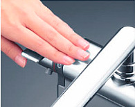 切替ハンドル・温度調節ハンドルとも、ハンドル正面と後ろ側の「ダブル突起レバー」により指にフィットし、にぎりやすさ、回しやすさが一段とアップしたハンドルです。せっけんのついた手でもラクに操作出来ます。