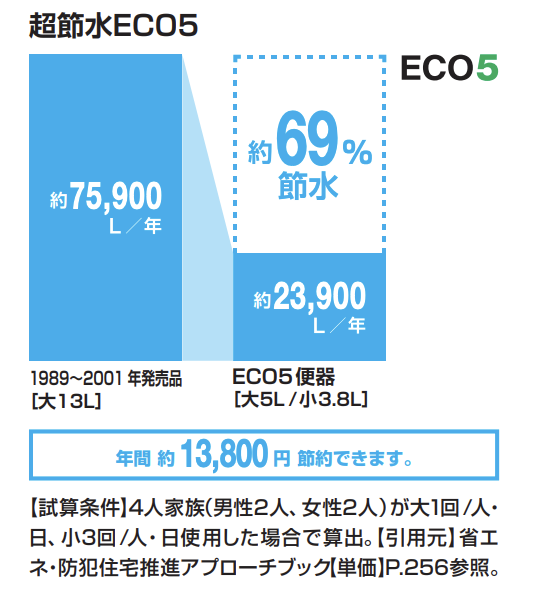 超節水ECO5(YBC-ZA20AH・DT-ZA251AH)【試算条件】4人家族(男性2人、女性2人)が大1回/人・ 日、小3回/人・日使用した場合で算出。【引用元】省エ ネ・防犯住宅推進アプローチブック【単価】P.256参照。 年間約13,800円節約できます。